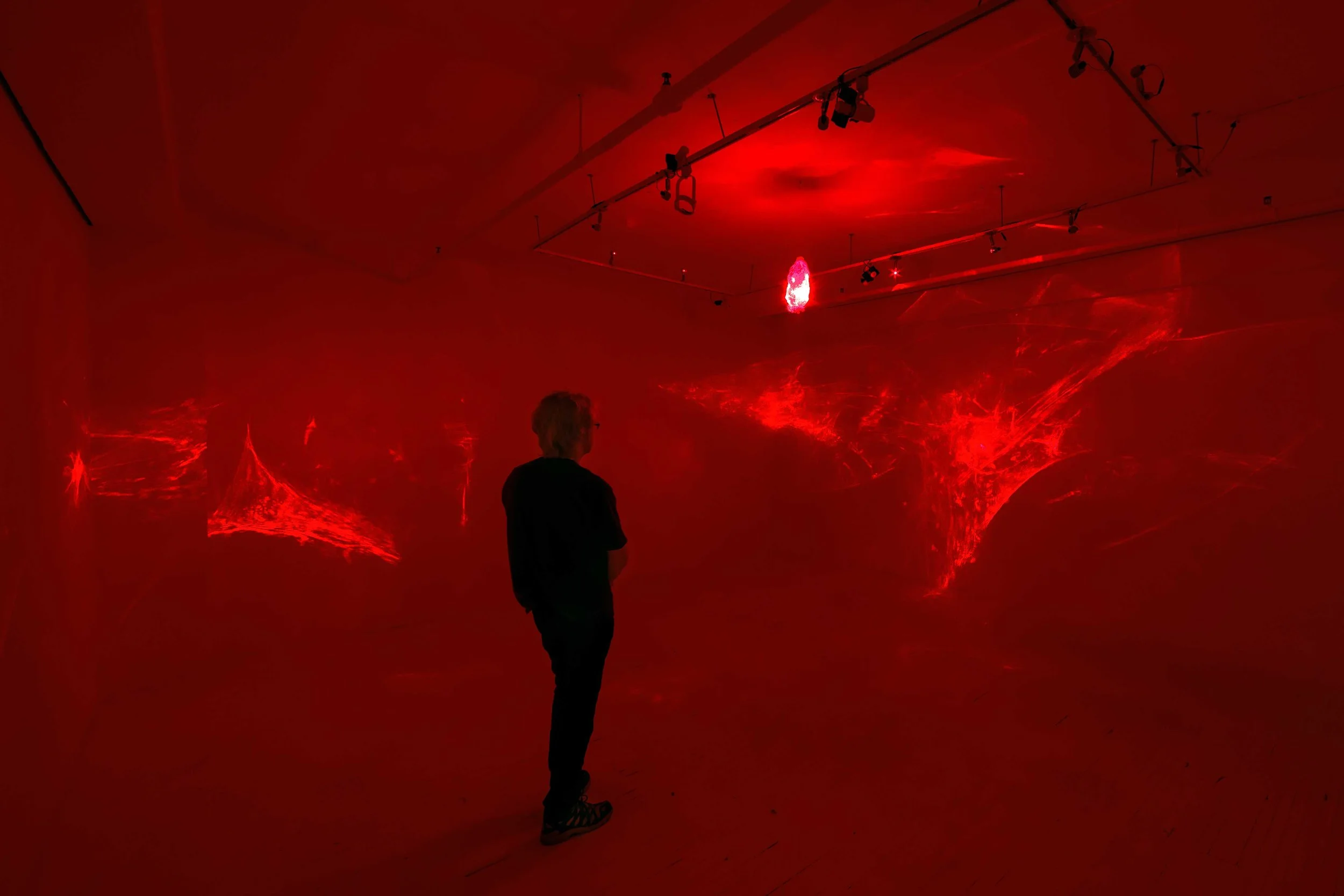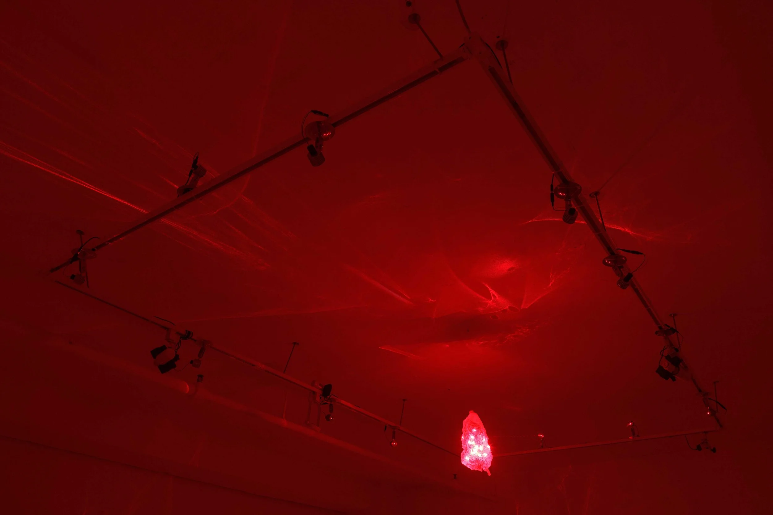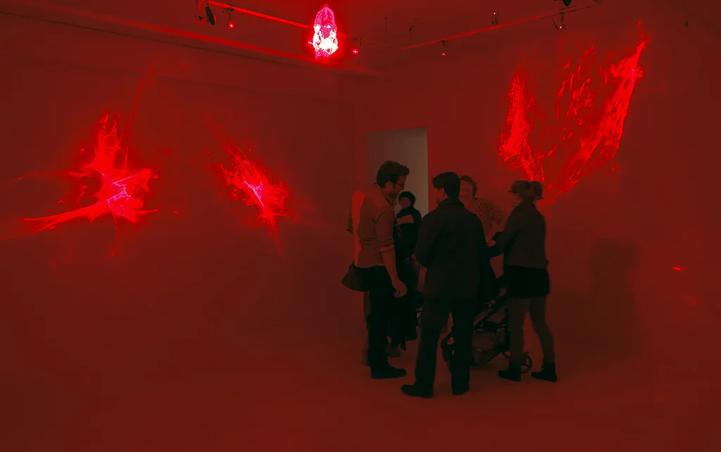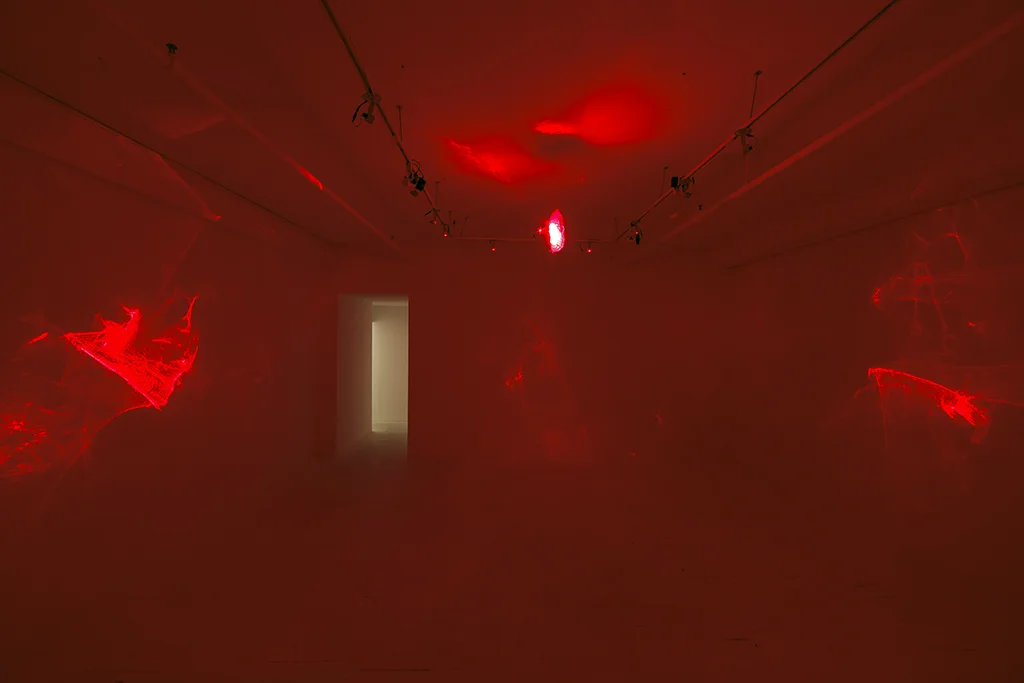 “Dans l’installation Diffraction, le plastique nous montre son potentiel miraculeux en stimulant un phénomène physique de diffraction de la lumière. Le principe au cœur du projet est un dispositif de projection lumineuse dans lequel une sculpture/lentille en plastique recyclé, suspendue au plafond, est traversée par douze lasers rouges, projetant dans l’espace des formes animées. Cette projection plonge le spectateur dans une immersion activée par le phénomène d’amplification lumineuse. Les lasers traversent la sculpture/lentille et dispersent une radiation photogène qui agit comme antithèse de l’ombre. La sculpture se voit donc magnifiée tout autour d’elle comme si elle se déployait dans l’espace pour mieux révéler son potentiel de transformation. Cette expansion visuelle produit une sensation étrange puisque nous vivons une expérience immersive tout en étant témoin de sa mécanique. Bien que le dispositif générant la projection lumineuse soit dévoilé, la magie du visuel et de l’immersion opère toujours.“
