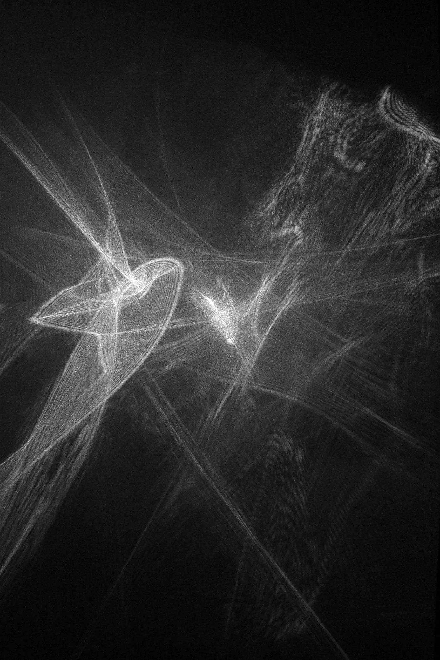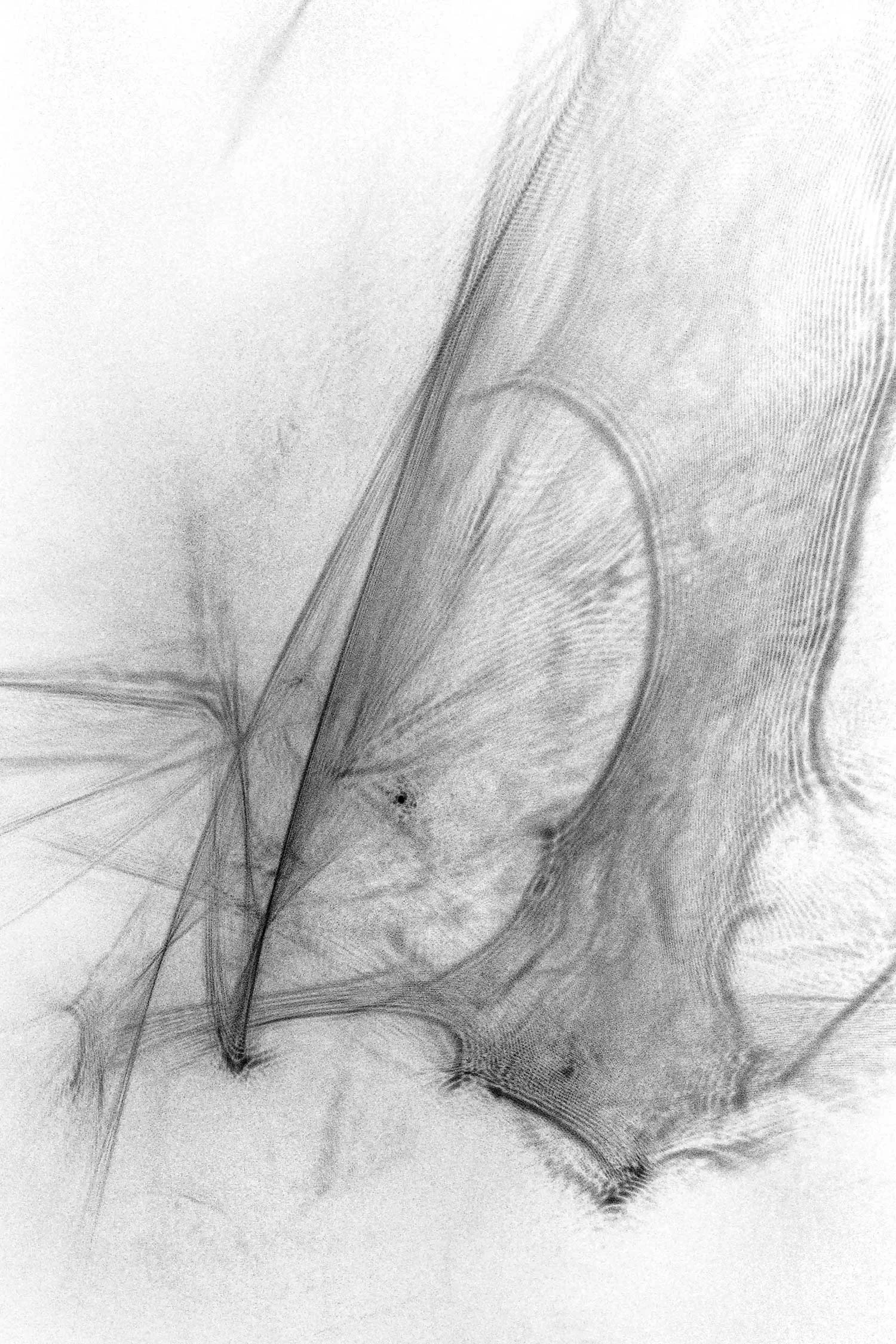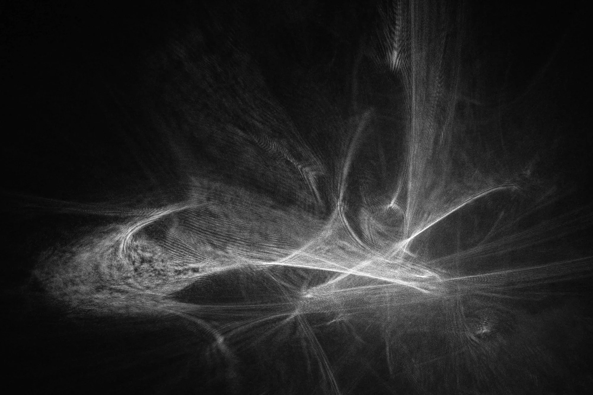 « Dans la série Diffraction : traces, c’est la ligne et l’utilisation du noir et blanc - faisant penser au graphite et au pastel sec - qui réfèrent au dessin. Des nébuleuses astrales aux parois internes et filamenteuses du corps humain, en passant par les rayons X ou les aurores boréales, les images aseptisées de Lamarche se jouent du réel et nous confondent; elles trompent notre œil. »
