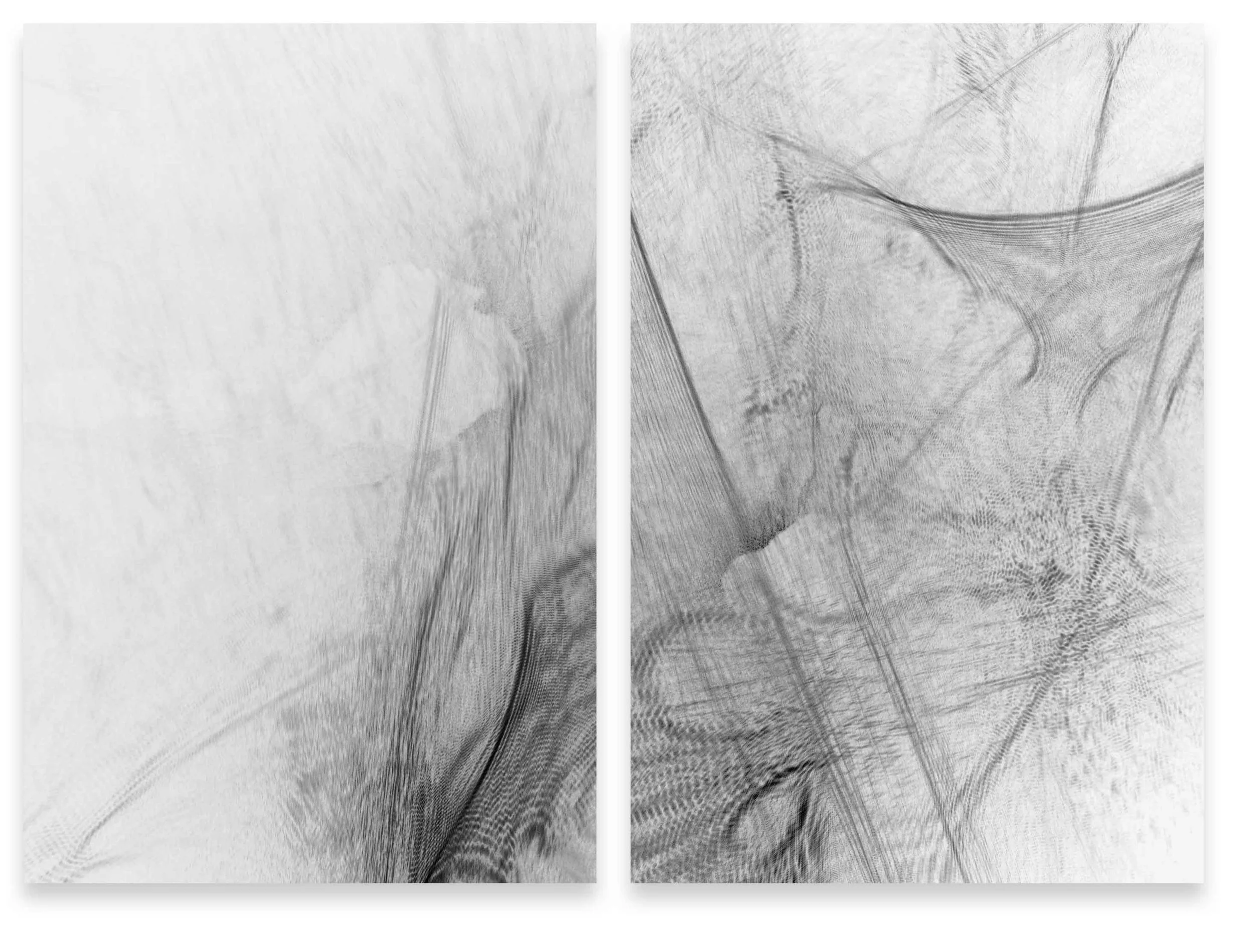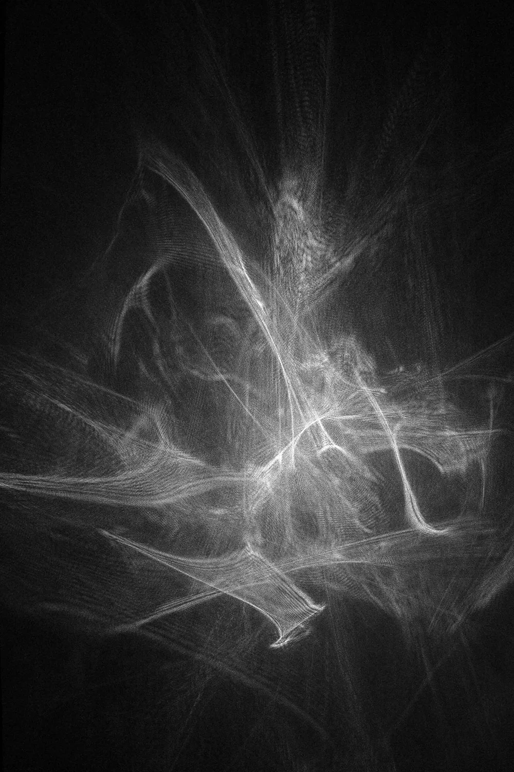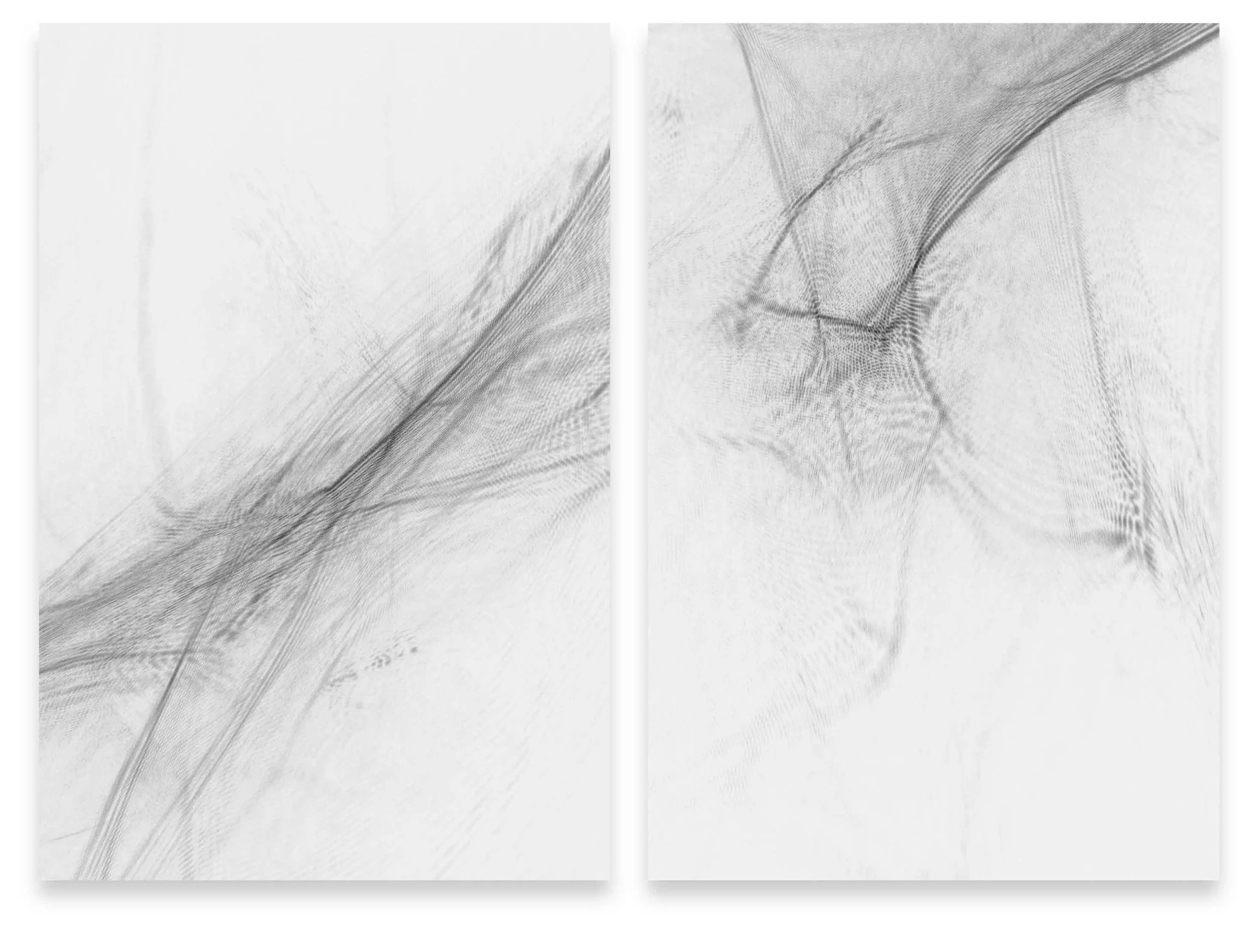 « Dans la série Diffraction : traces, c’est la ligne et l’utilisation du noir et blanc - faisant penser au graphite et au pastel sec - qui réfèrent au dessin. Des nébuleuses astrales aux parois internes et filamenteuses du corps humain, en passant par les rayons X ou les aurores boréales, les images aseptisées de Lamarche se jouent du réel et nous confondent; elles trompent notre œil. »