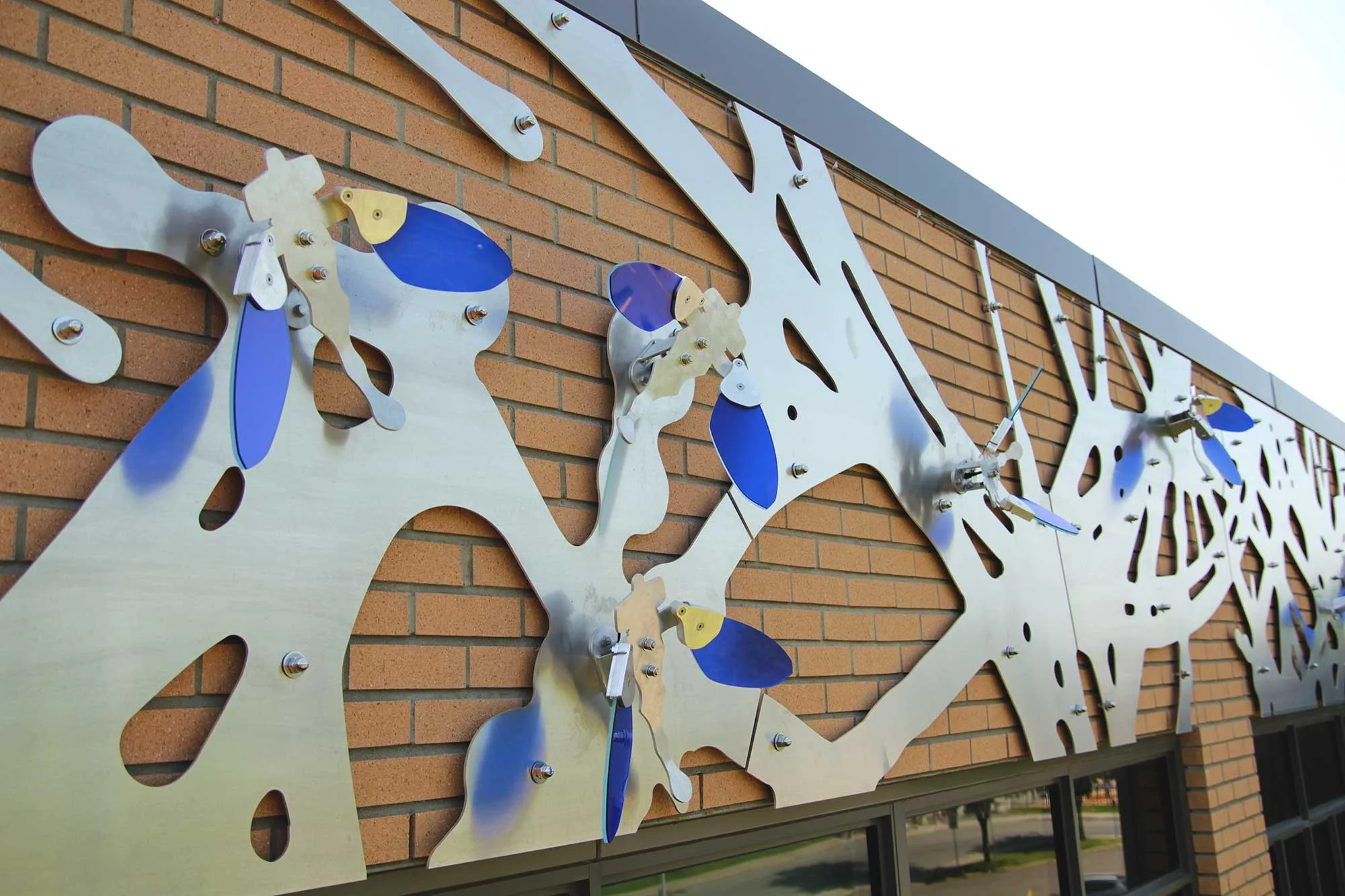 Faire son nid nous plonge dans un univers de fiction dans lequel évolue une espèce hybride. Ces spécimens technos aux ailes lumineuses travaillent à construire un nid assemblé de pièces mécaniques qu’ils trouvent ici et là. Les ailes possèdent un dispositif lumineux qui s’allume et s’éteint doucement, chacun à son propre rythme. Ce signal lumineux est une langue universelle commune à tous les spécimens hybrides de la murale. Pour communiquer et évoluer avec autrui, ne faut-il pas arriver à se rejoindre et se comprendre ?