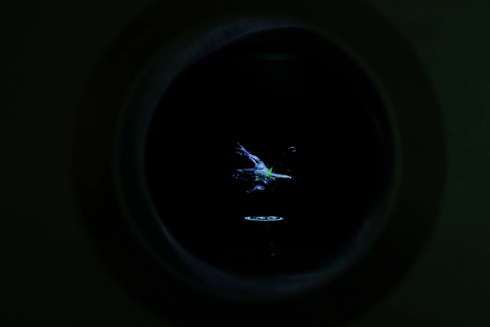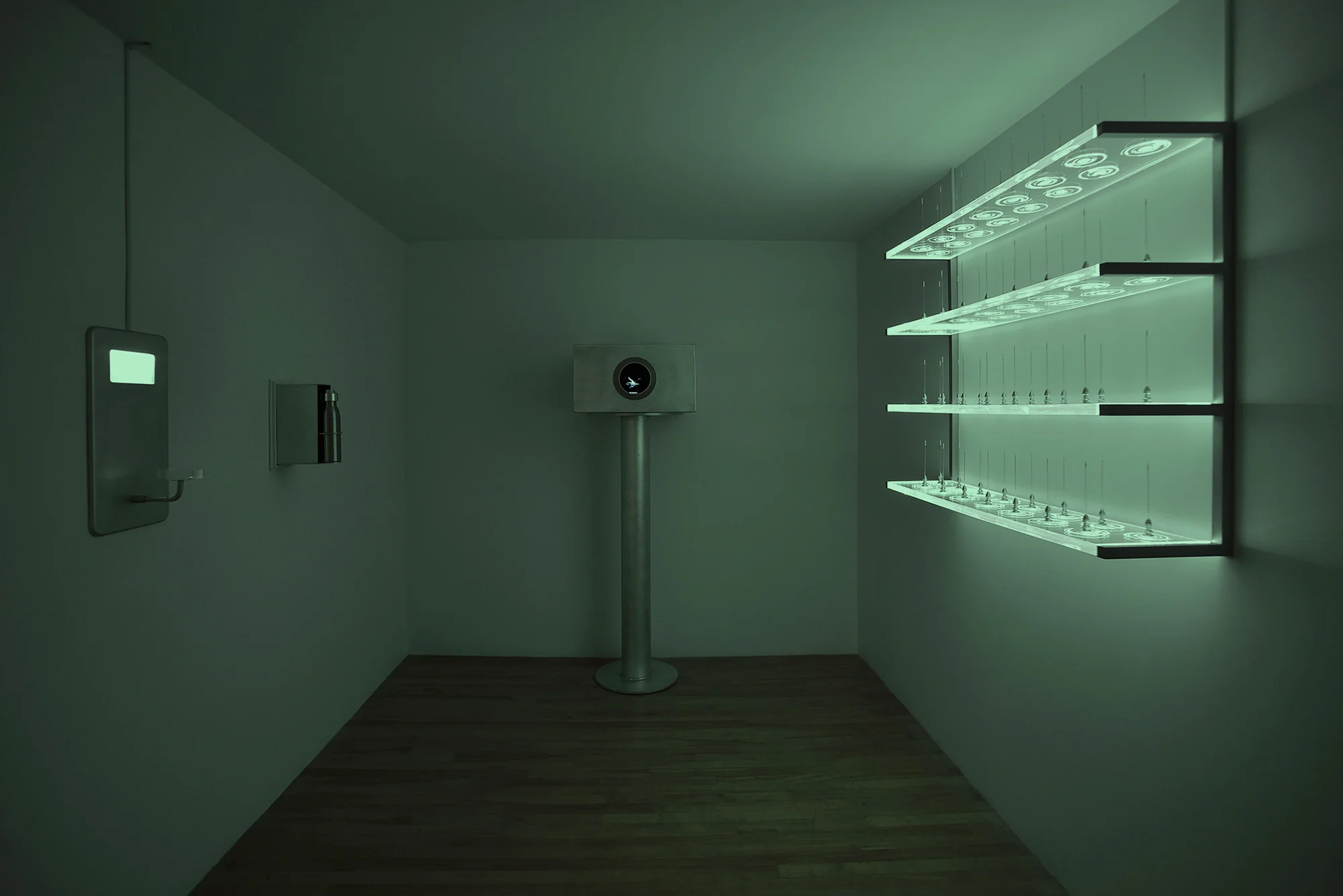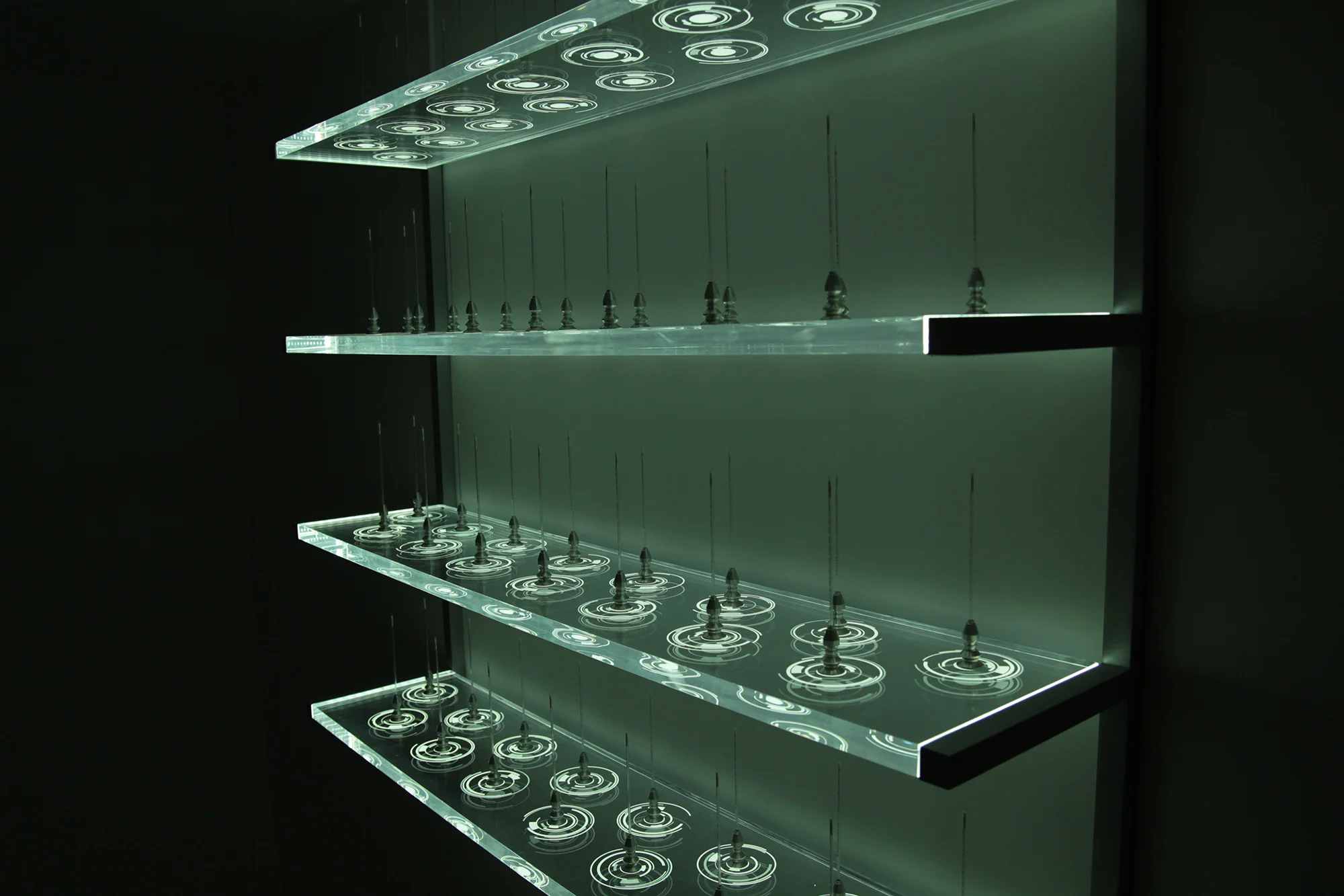 ”Sitôt franchi le seuil de l’installation, le public se croit le visiteur privilégié d’un lieu secret, tenu loin des regards. Un présentoir l’invite pourtant à porter son attention sur de délicates composantes, chacune rehaussée par un socle serti d’un halo lumineux. Les fines tiges, nommées paillettes, jouent un rôle crucial dans les activités du Centre d’insémination artificielle du Québec (CIAQ) qui a spécialement ouvert ses portes à l’artiste. Chacune des paillettes arbore distinctement le code qui retrace avec fiabilité l’origine de la semence bovine. Sous sa forme compacte, la paillette peut voyager parfois très loin, au Québec et à l’international, depuis l’entreprise sise à Sainte-Madeleine.”