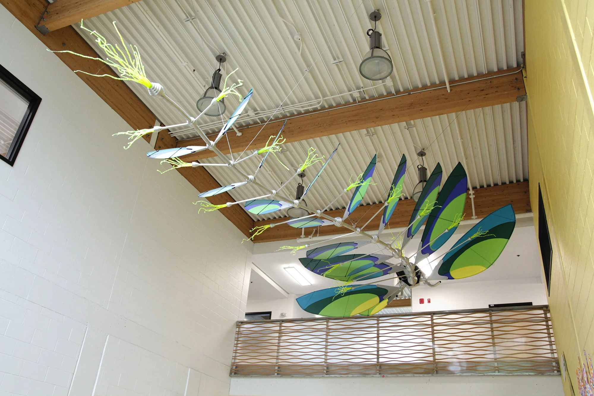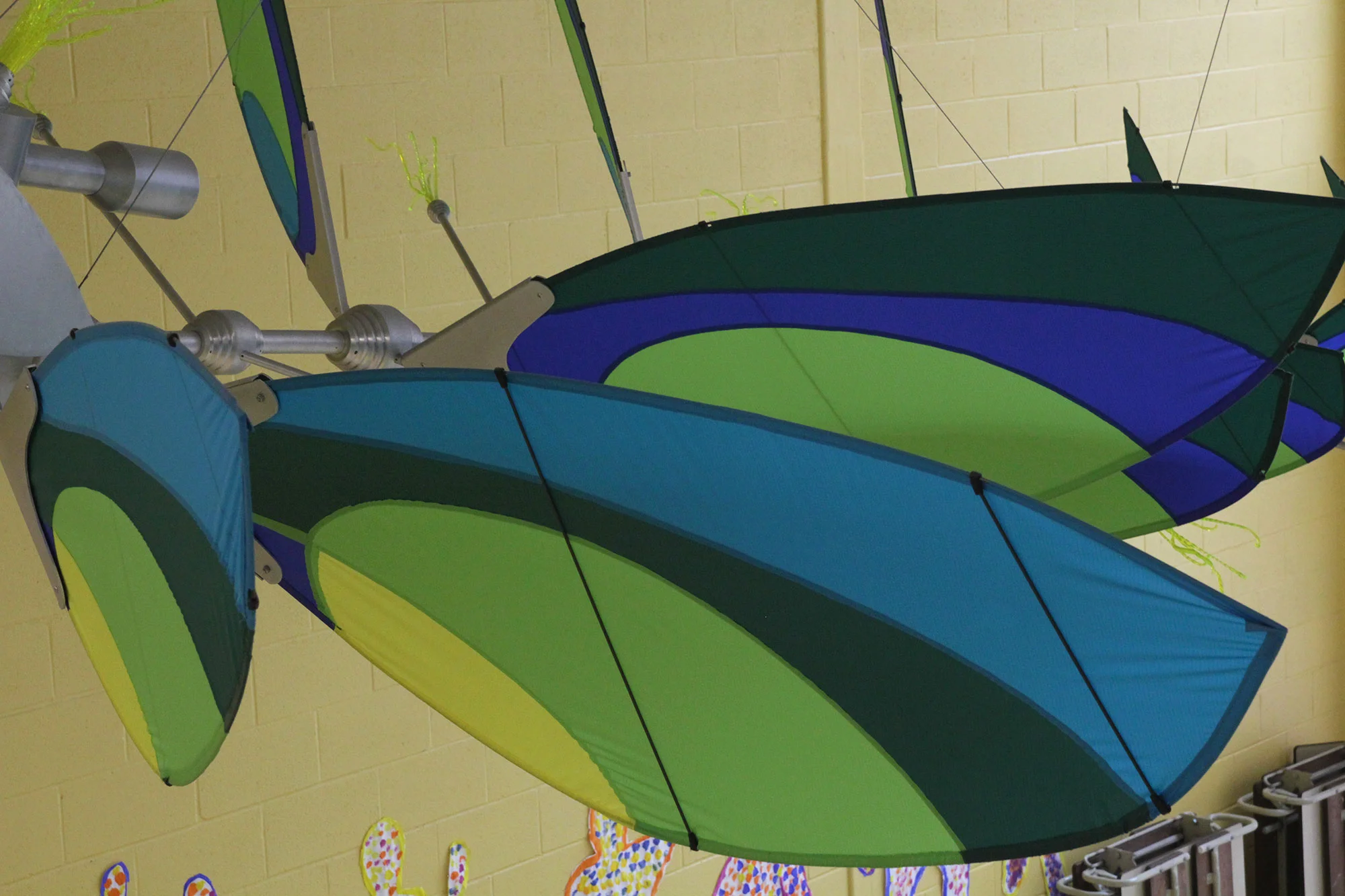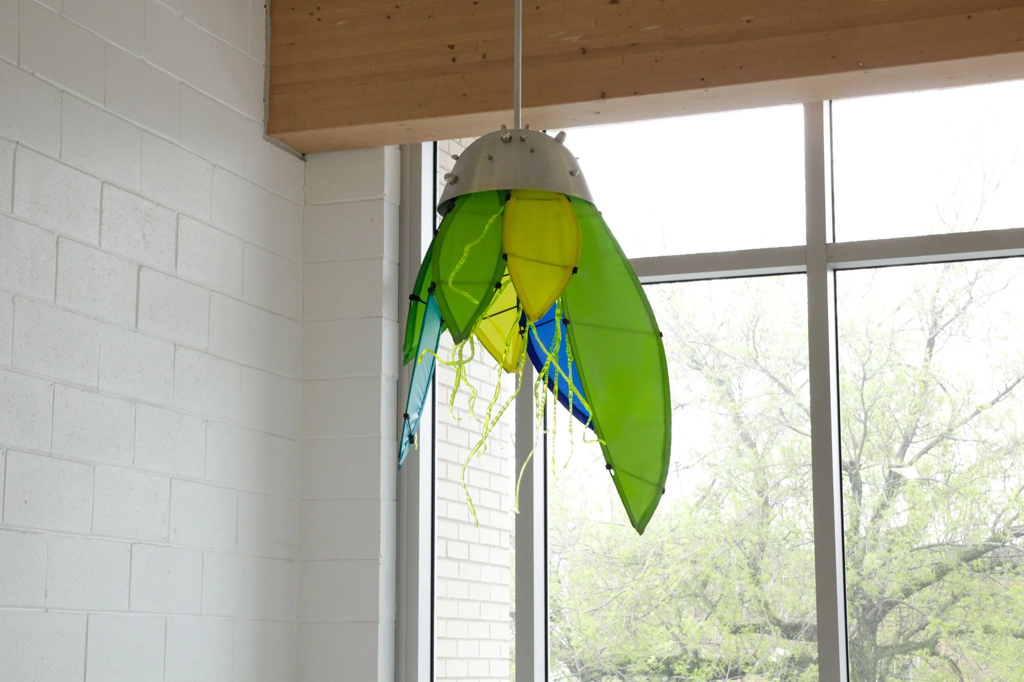 L’envol nous plonge dans un univers fictionnel dans lequel évolue un spécimen ailé d’inspiration orientale qui semble être sorti d’un cocon. Le cocon suspendu au-dessus du vestibule représente l’enveloppe protectrice dans laquelle s’opère une gestation. De cette structure ovale semblent vouloir sortir les ailes de l’aérodyne hybride. C’est comme si l’on assistait à son éclosion, à sa naissance. Une fois arrivé à maturité, le spécimen qui en émerge – disposé dans l’atrium – prend son envol. Dans cette oeuvre, plusieurs éléments figuratifs s’entremêlent, révélant des connexions inusitées et ludiques entre art et science, entre nature et artifice.