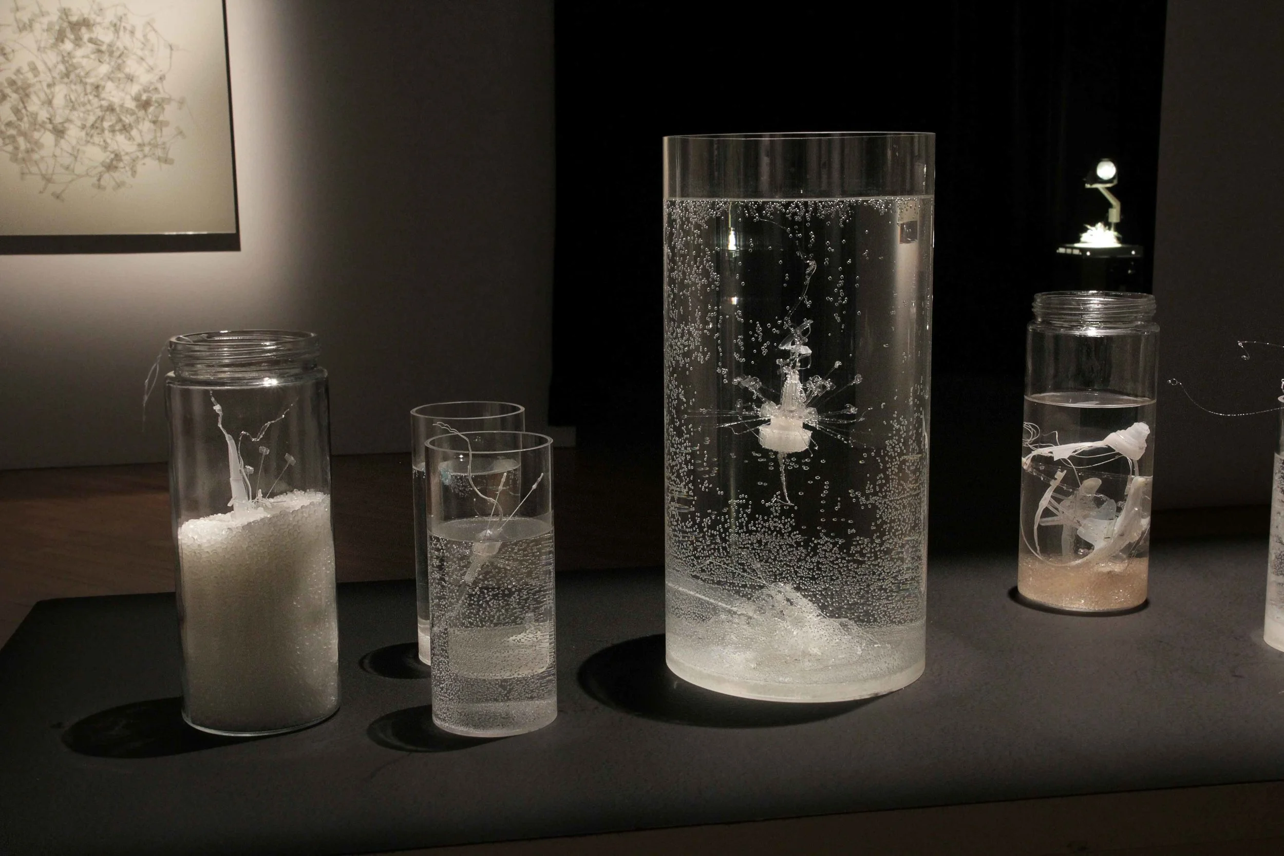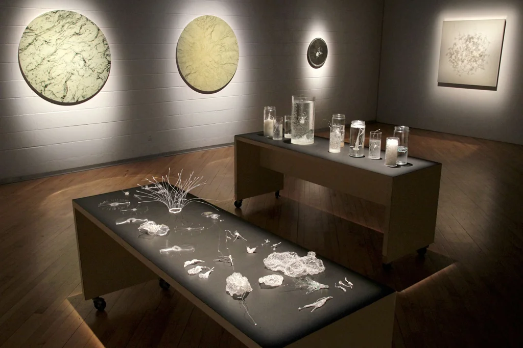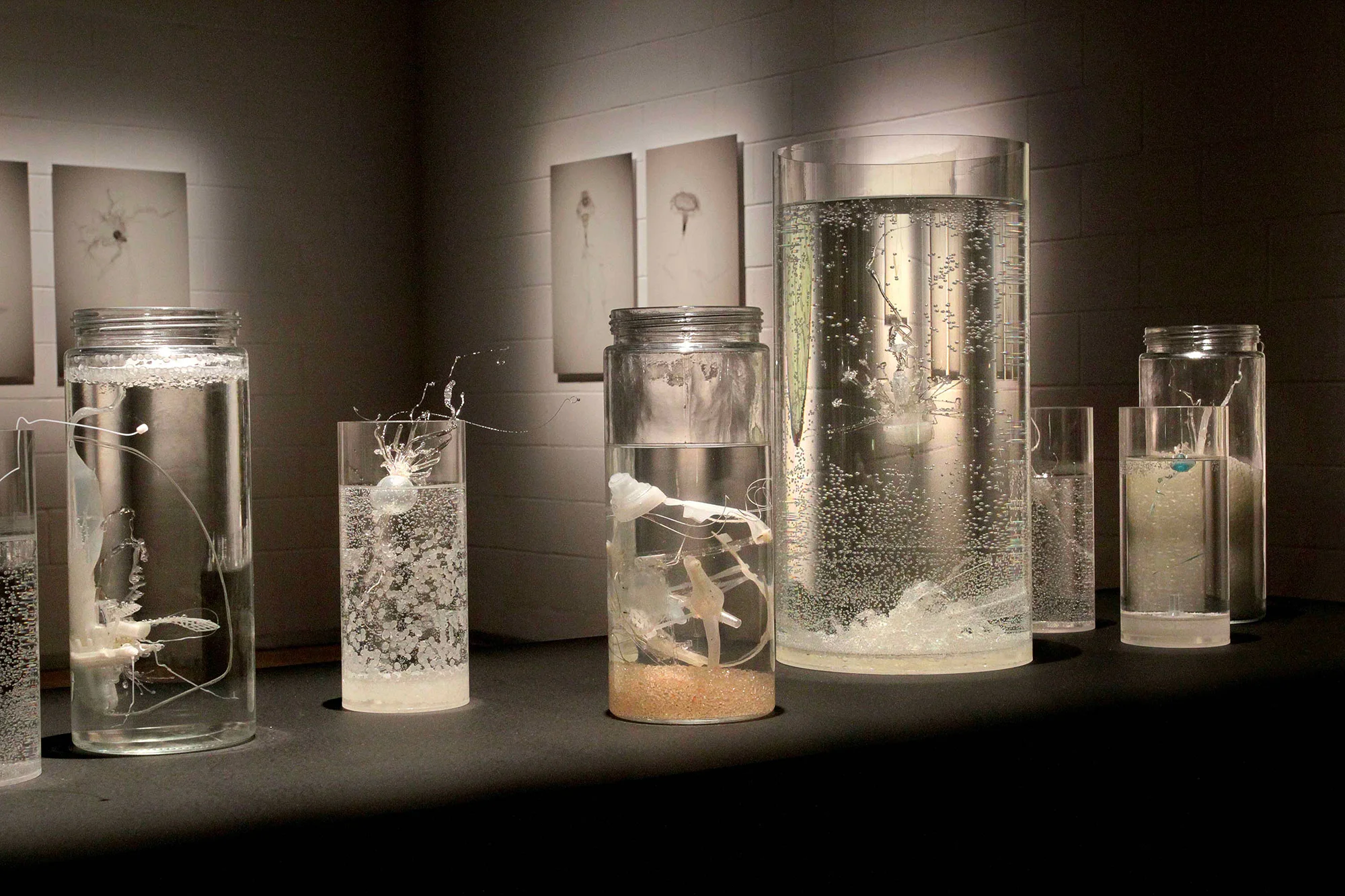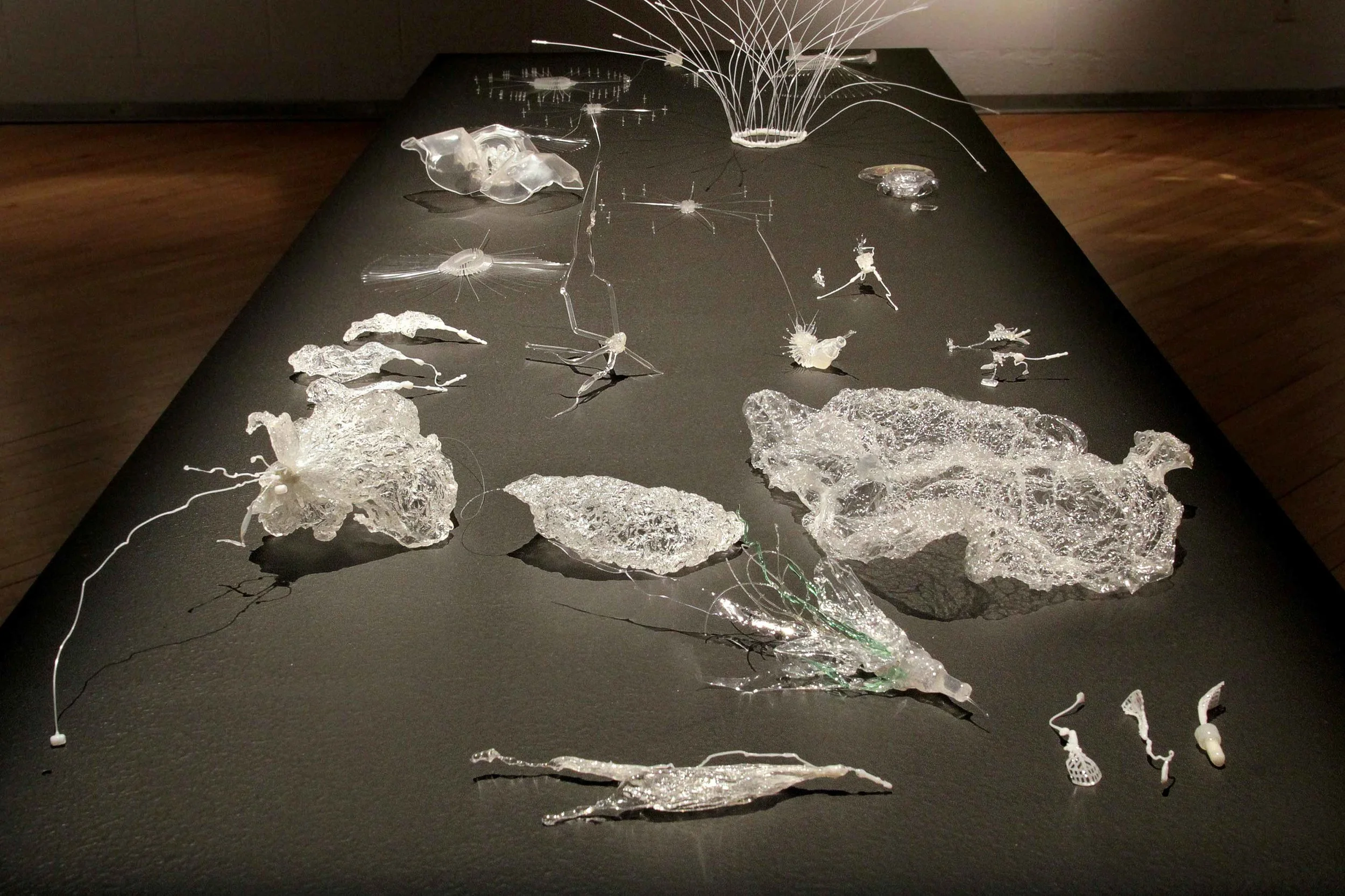 “L’univers des sciences dispose d’un vaste terrain d’expérimentation dans lequel le chercheur oeuvre au moyen d’hypothèses, de méthodes, de techniques et de protocoles. Il partage avec celui de la recherche artistique plusieurs problématiques et, de surcroît, un mandat commun: la découverte. Si les représentations macroscopiques du ciel étoilé semblent aujourd’hui faire partie des images devenues familières, il semble peu probable de penser que quelques morceaux de plastique – un matériau si banal ! – puissent susciter l’émerveillement. Et pourtant… L’artiste sait comment faire basculer notre perception de la matière ; parfois il ne s’agit que de modifier l’échelle des dimensions entre le réel et sa représentation.”