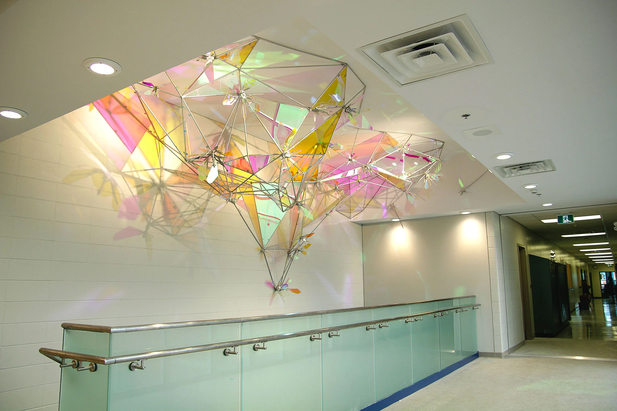 Par l'utilisation de la lumière et de multiples couleurs, l'artiste a voulu représenter une source d'énergie dynamisant le point de rencontre entre la structure, les fleurs de cristal et les spécimens.