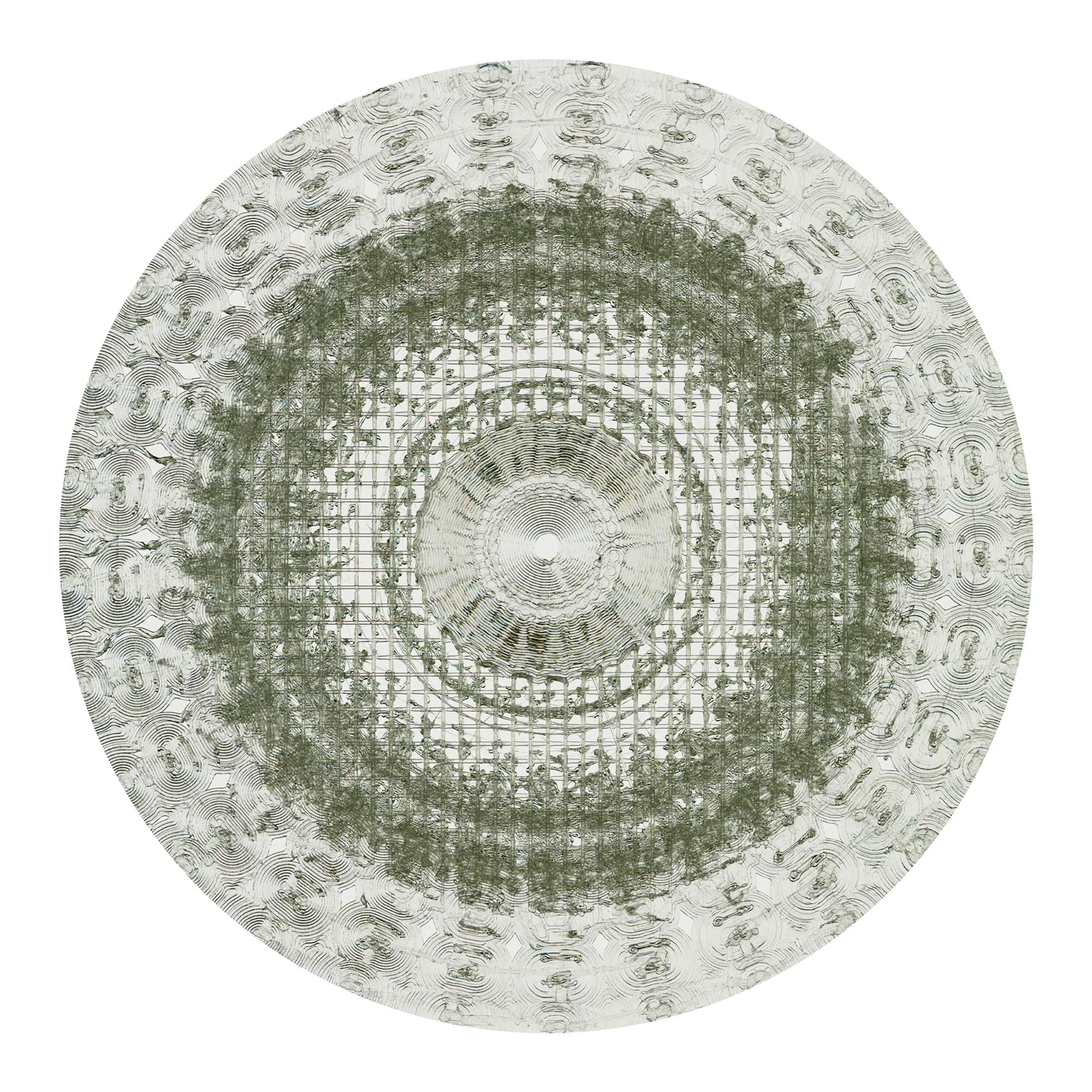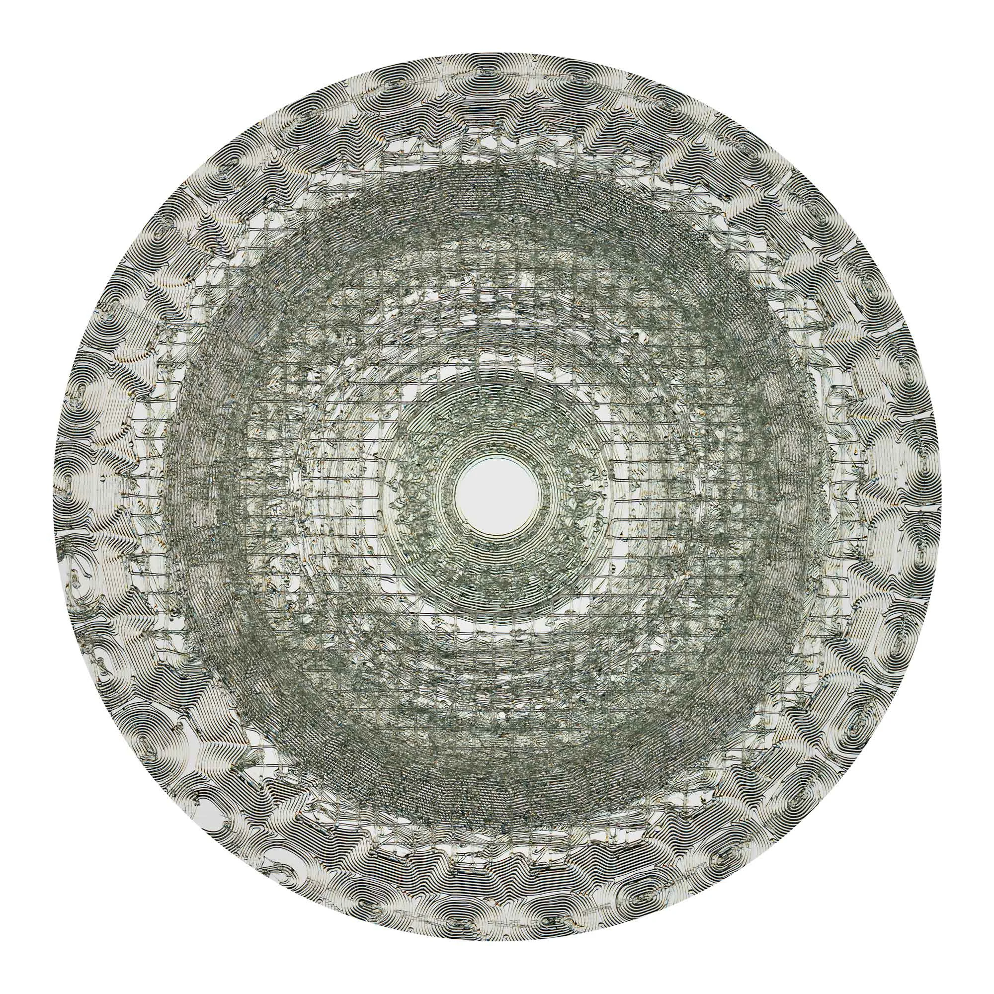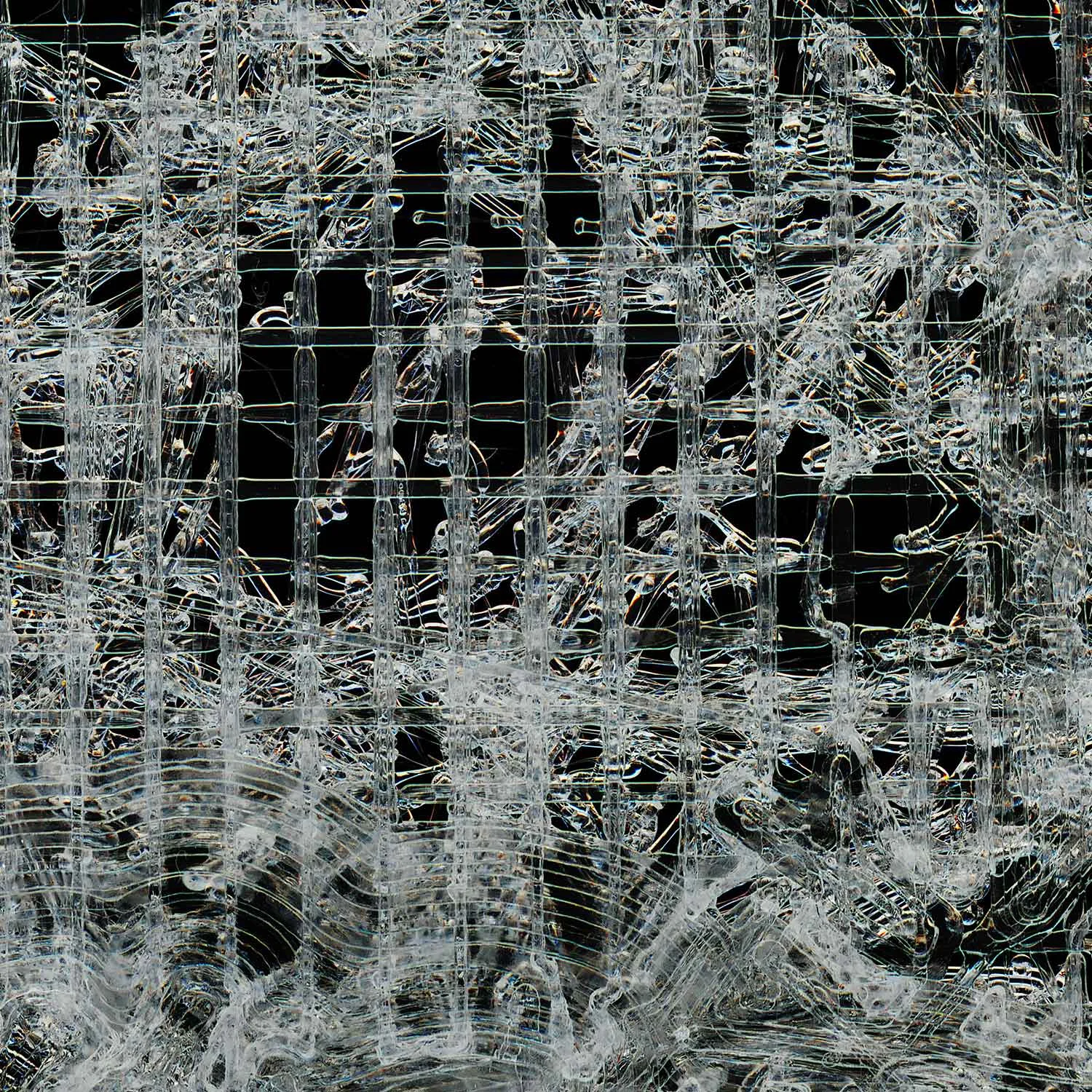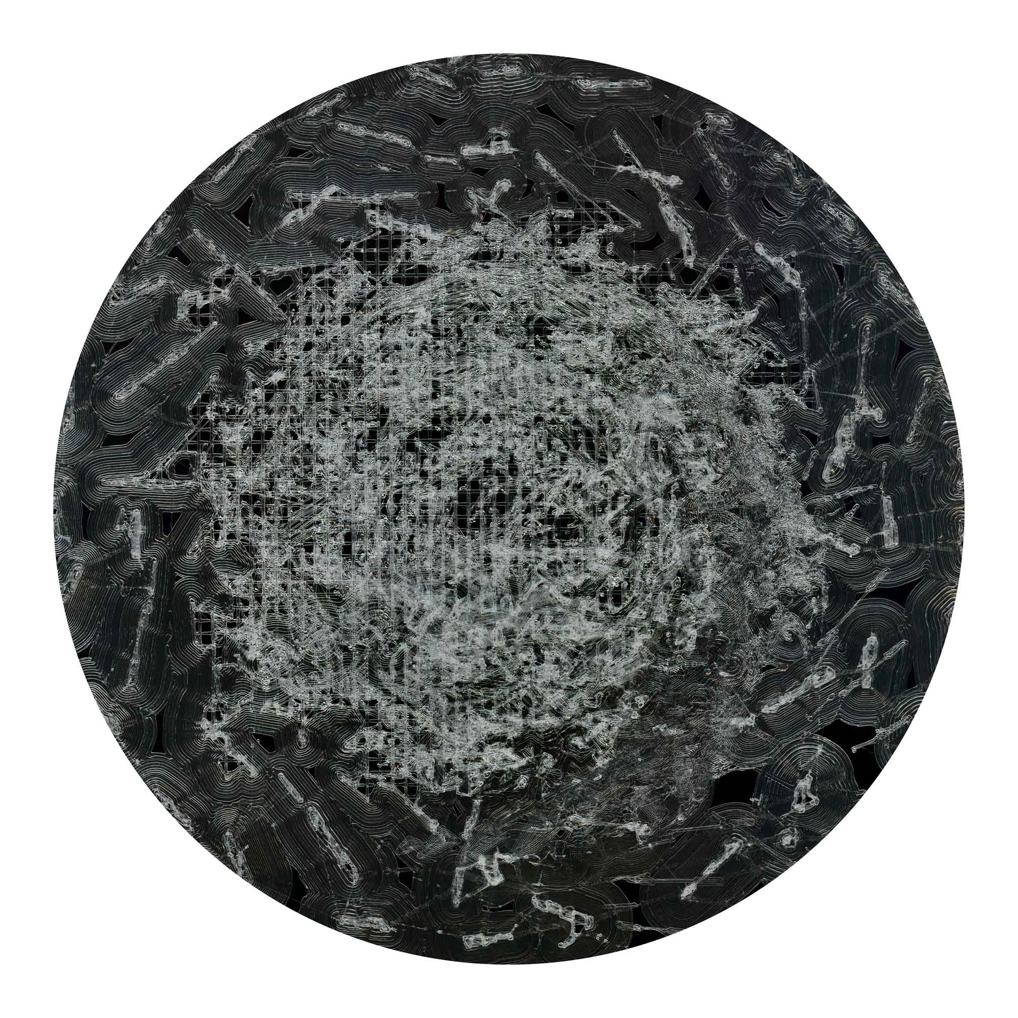 Les origines et les enquêtes sur le vivant inspirent la série Zone de contact. Ici, nous observons la carte du corps post-humain dans un iris modifié étrangement familier, fait de maillage des fils de nylon. Le tout évoque la finesse et la complexité du langage cartographique.